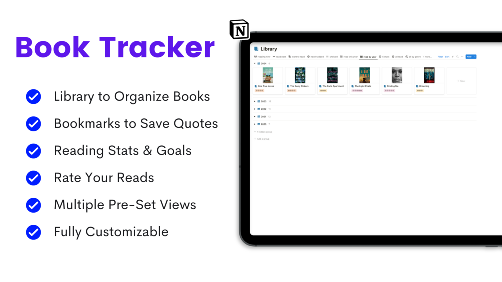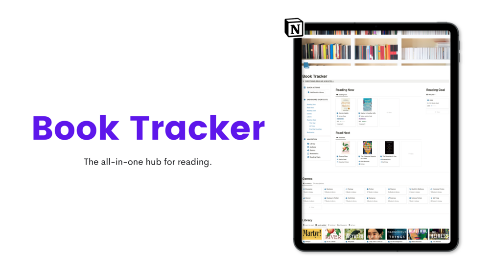 This template helps readers create a digital library of books, organize books by status, author, or genre, set reading goals and track reading progress, rate and review books, and create bookmarks, all in one place.